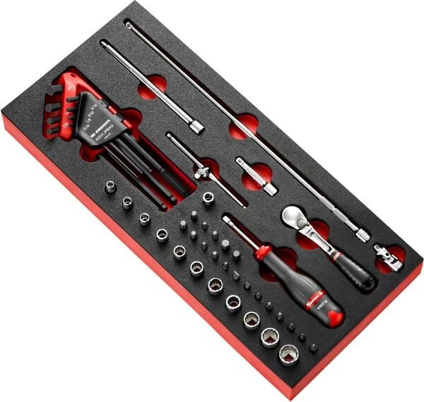 Se compose de : - Module en mousse - Cliquet réversible - Poignée coulissante - 3 rallonges - 11 clés à tube 1/4'' R.E de 3/16'' à 9/16'' - Jeu de clés Allen - Porte-embouts 1/4'' - Cardan universel - Clé à douille porte-embout : 1/4” - Embouts : Pozidriv® : 1 - 2 - 3 - Embouts : Phillips® : 1 - 2 - 3 - Embouts : Schlitz® : 4,5 - 6,5 - Embouts : Allen : 3 - 4 - 5 - 6 - 7 mm - Embouts : Resistorx® : 15 - 20 - 25 - 30 - 40