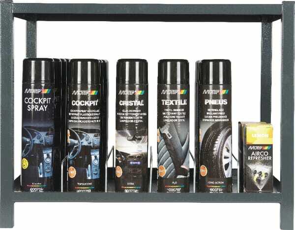 Dimensions : 58.0x34.0x44.4 cm Informations techniques : Assortiment d'aérosols Motip pour entretien de véhicules, composé de mousse multi-usages, nettoyant brillant, nettoyant vitre, nettoyant textile, cire à pneu, nettoyant climatisation S'adapte à 1 module haut