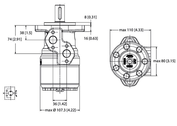 Forme de la bride : Ovale Code de la bride : A2 Diamètre de bride : 106,4 mm Nombre de trous de montage : 2 Diamètre du trou de montage : 82,5 mm Type d'arbre : Cannelé Diamètre de l'arbre : 1 Inch Cylindrée : 125 cm³/rev Couple en continu max. : 330 N·m Couple de démarrage min. : 295 N·m Type d’étanchéité : Haute pression Pression de service en continu max. : 200 bar Pression de service intermittente max. : 225 bar Pression de démarrage min. : 10 bar Débit max. : 60 l/min Vitesse de rotation max. : 475 r/min Diamètre de filetage de port principal : 1/2 Inch Type de filetage de port principal : G Diamètre de filetage de raccord de vidange : 1/4 Inch Type de filetage de raccord de vidange : G Position du port : Côté Puissance max. : 14 kW Longueur de boîtier : 146,2 mm Particularités : - Flexibilité avec différentes combinaisons d'arbres et brides Domaine d'application : - Partout où un couple élevé et un régime faible sont nécessaires, p. ex. : - Epandeuses. - Véhicules de chargement. - Entraînements de convoyeurs à raclettes - Vis transporteuse - Botteleuse - Treuils - Machines communales, agricoles, sylvicoles et engins de chantier Informations techniques : - Avec évacuation de l'huile de fuite - Type rouleaux - Large palier lisse d'arbre - Peut être raccordé en série à d'autres moteurs - Convient pour une utilisation dans les systèmes fermés - Appartient à la série des moteurs orbitaux de taille moyenne Avantages : - Particulièrement adapté à un mode d'inversion fréquent - Grande efficacité - Pression continue élevée - Grande longévité.