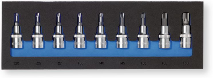 Coffret plastique 9 pièces douilles TX 1/2' longueur 55 mm dimension T 20 - 25 - 27 - 30 - 40 - 45 - 50 - 55 - 60. (par 1)