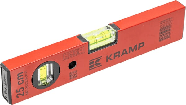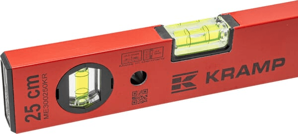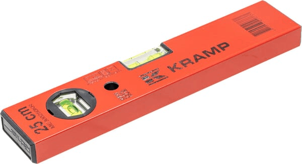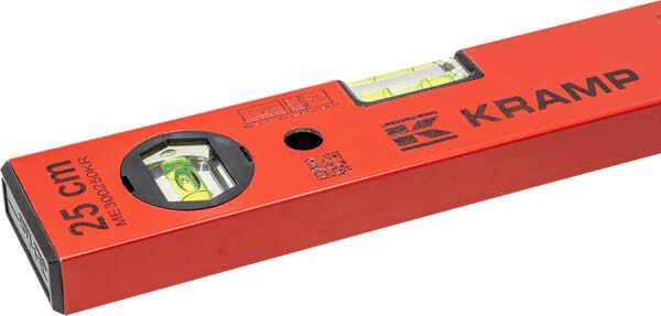 Niveaux à bulle Kramp avec bulle horizontale et verticale en forme de tonneau en verre acrylique incassable fixée collée dans le corps du niveau à bulle.