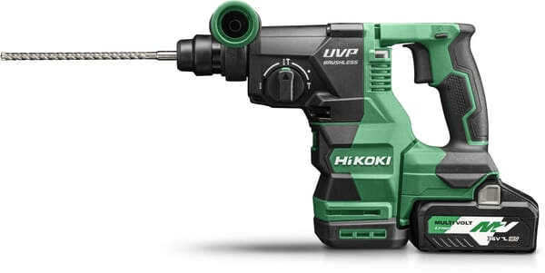 Marteau perforateur et burineur Hikoki SDS-Max avec trois fonctions, perçage à percussion, perçage et burinage. La perceuse est équipée du système Hikoki RFC (reactive force control), ce dispositif de sécurité arrête l'outil pour protéger l'utilisateur lorsqu'une surcharge provoque un blocage soudain de la perceuse et que la machine veut tourner sur son axe.