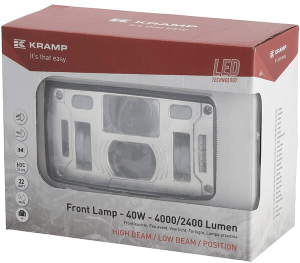 Phare LED, 40/22W, rectangulaire, 10-30V, 185x102x82, feu de route/croisement, feu de position, connecteur H4, Kramp