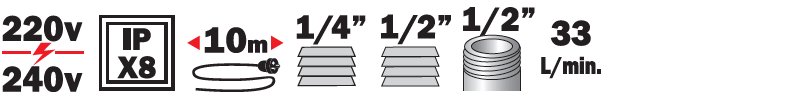 Moteur 220/240 V - 50 Hz. IP X8.