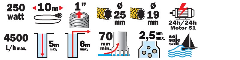 Puissance 250 Watt : Débit max. 4500 L/h.