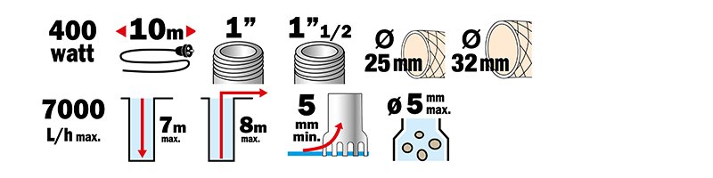 Pompe automatique “vide-cave“ à flotteur intégré. 2 fonctions : automatique (marche/arrêt en fonction du niveau d’eau) ou manuel (en continu). Diamètre des particules en suspension 5 mm. Puissance 400 W. Débit 7 000 l/h. Aspire jusqu’à 5 mm du sol. Profondeur d’immersion 7 m. Hauteur de refoulement 8 m.