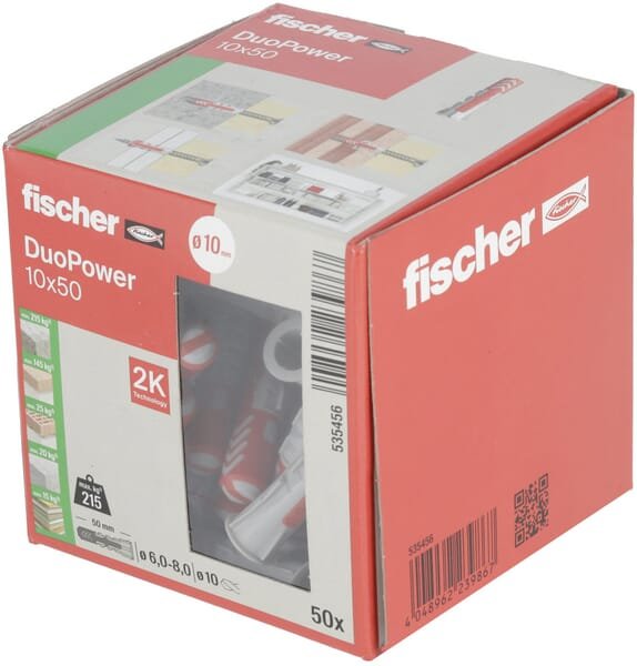 Le Fischer Duopower est une fiche intelligente à 2 composants, et grâce à sa plus grande profondeur d'ancrage, il est particulièrement adapté au montage dans les matériaux de construction perforés, le béton cellulaire et pour ponter les couches de plâtre.