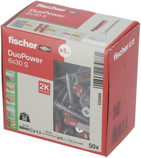 Le Fischer Duopower est une cheville intelligente à 2 composants, et grâce à sa plus grande profondeur d'ancrage, il est particulièrement adapté au montage dans les matériaux de construction perforés, le béton cellulaire et pour ponter les couches de plâtre.