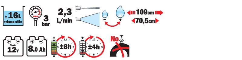 Pulvérisateur électrique sur roues ± 16 litres "Pila 16". Batterie 12 V - 8,0 Amp. Chargeur 220-240V - 50/60 Hz. 12 V - 1200 mA. Pression de travail : 3 bars et 0 à 3 bars par variateur. Chariot équipé de 2 roues Ø 150 mm et d’une poignée à