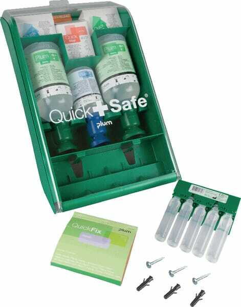 Comprend : - Armoire antipoussière et hygiénique - 18 gels apaisant les brûlures QuickCool - 1 pansement pour plaies QuickStop - 20 nettoyants pour plaies QuickClean - 2 bains oculaires Plum de 500 ml - 1 flacon de 200 ml pH Neutre - 5 ampoules de bain oculaire QuickRinse de 20 ml - 1 recharge de pansements élastiques QuickFix