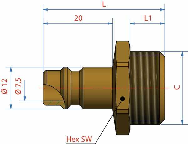 Forme : Droit Type de raccord n°1 : Raccord rapide Type de raccord n°1 - mâle/femelle : Mâle Diamètre raccord n°1 : 7,2 mm Longueur du filetage du raccord n°1 : 9 mm Type de raccord n°2 : Filetage Type de raccord n°2 - mâle/femelle : Mâle Diamètre de filetage raccord n°2 : 3/8 Inch Type de filetage raccord n°2 : BSP Conçu pour les moyennes : Air Norme ISO : 228 Longueur totale : 33 mm Matériau : Laiton Pression de service maximale : 35 bar Température de service maximale : 100 °C Température de service min. : -20 °C Poids : 26 gr Interchangeable avec : Festo