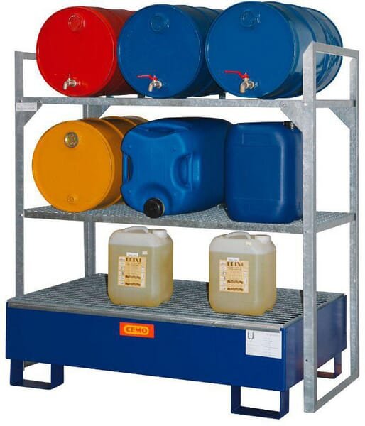 Rack à fûts pour un stockage homologué et peu encombrant des fûts et autres conteneurs. Les racks sont entièrement galvanisés à chaud et disposent d'un bac de collecte en plastique renforcé de fibre de verre anticorrosion pour une utilisation sûre à long terme. L'excellent plateau de récupération permet de remplir des cruches, des bouteilles, des jerricans et autres, à partir du support. Le rack est adapté de manière optimale aux conditions d'exploitation actuelles.