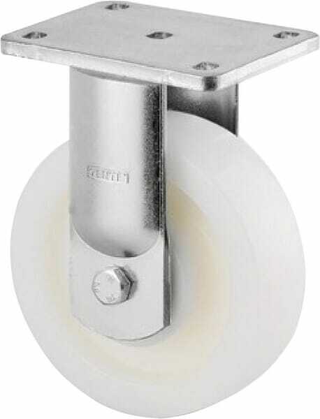 Informations techniques : Roulette fixe, Chape en acier, Finition zinguée, Axe de roue boulonné, Fixation à platine. Corps de roue polyamide, forte charge, roulements à billes de précision