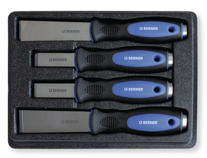 Set 4 racloirs lame inox avec tête de frappe, poignée bimatière, lame épaisseur 1,2mm et 2,6 mm, largeur 20 et 32 mm. (par 1)