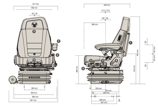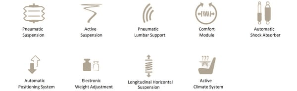 Particularités : - Siège avec suspension pneumatique - Réglage du poids entièrement automatique - Suspension longitudinale, blocable - Suspension basse fréquence - Climatisation de siège active, ventilateur dans le rembourrage - Suspension active