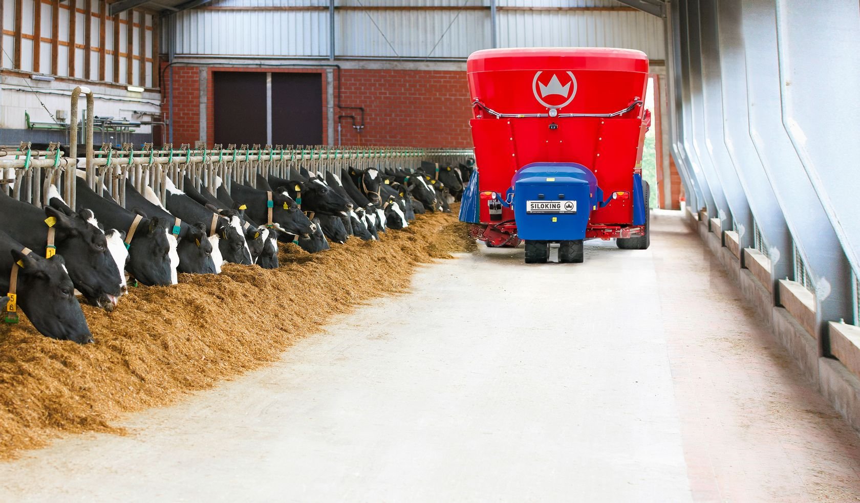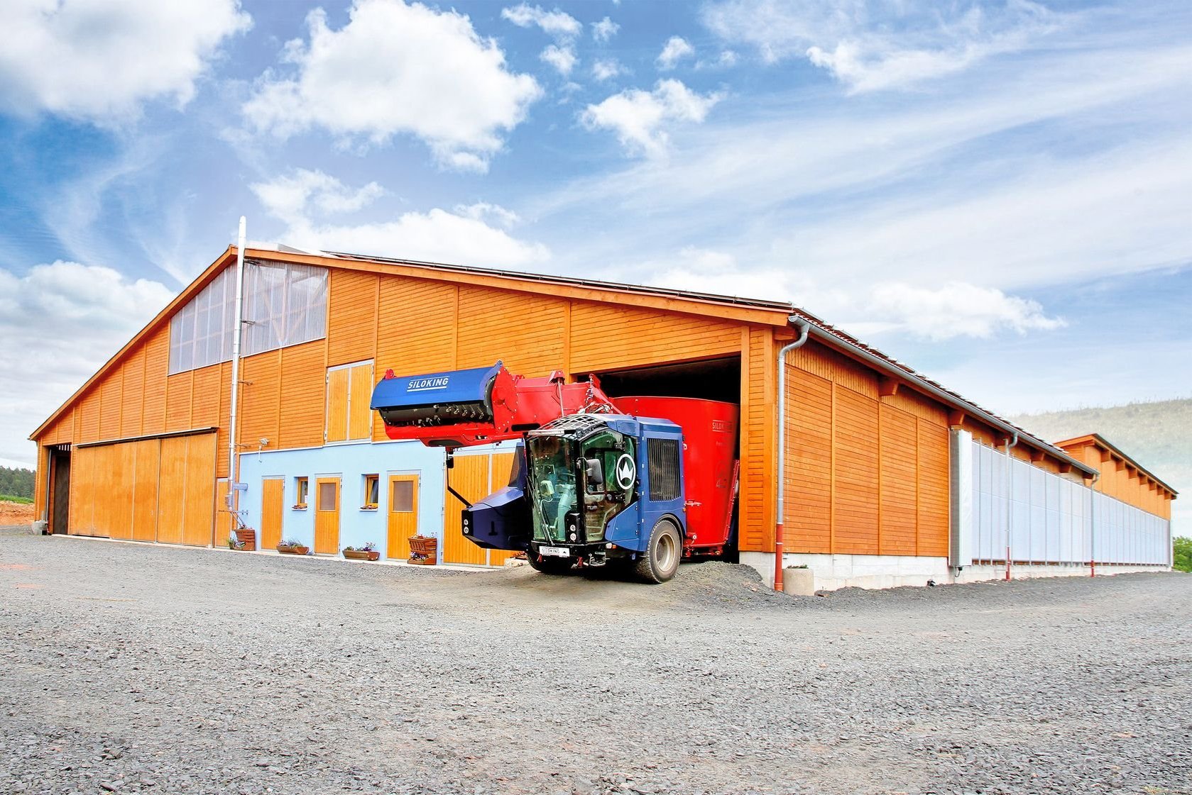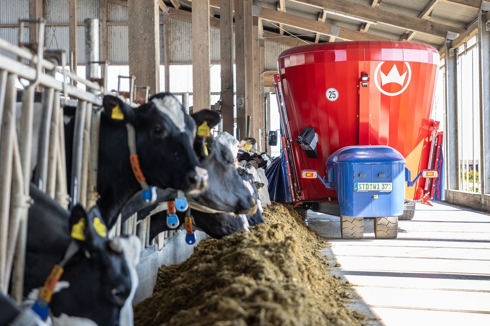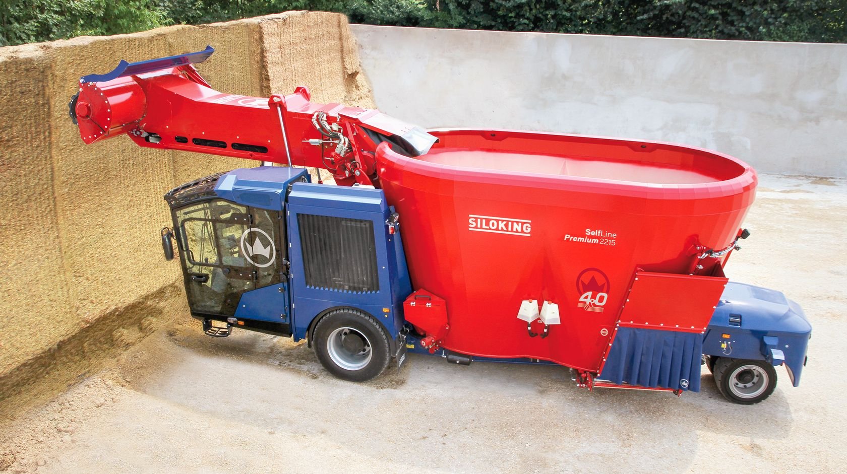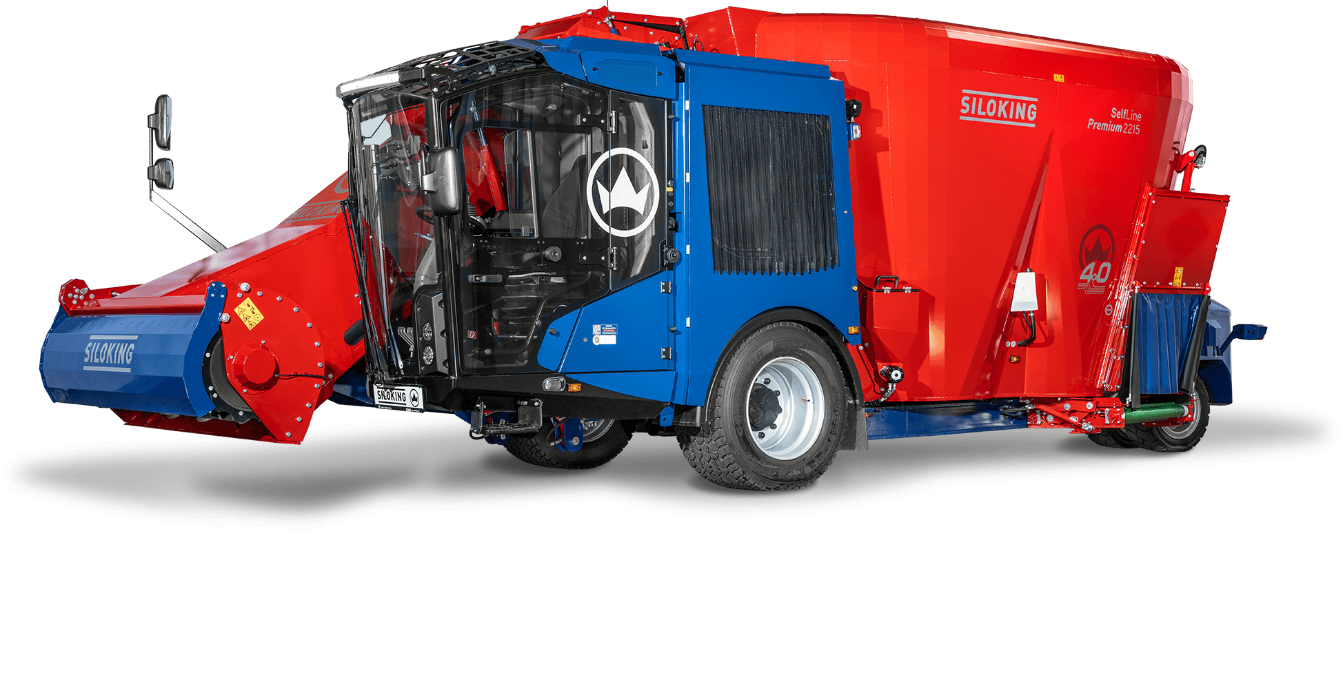 La solution idéale pour les grandes exploitations et les exploitations avec des groupes de production plus importants en raison du haut volume. Tous les modèles Premium peuvent prélever le fourrage jusqu'à 5 m de hauteur grâce au long bras de fraisage. L'entraînement est ici assuré en standard par le moteur diesel Volvo 4 cylindres turbo de 129 kW (175 ch) et en option par la version de 160 kW (218 ch). De plus, la machine se distingue par un rayon de braquage minimal grâce à son châssis à 3 points. Pour une conduite confortable même sur des chemins en mauvais état, la machine peut être équipée en option d'une suspension à roues indépendantes - un standard sur SelfLine 4.0 Premium 2215-22. „ châssis à 3 points (Premium 15 / 19) ou châssis à suspension pneumatique (Premium 22) pour une faible hauteur et une manoeuvrabilité extrême (Premium 22 : suspension à roues indépendantes à l'arrière) „ variation continue de la vitesse via pédale d'accélérateur, 1 mode de marche (0 à 15 km/h) (Premium 15 / 19) ou 2 modes de marche (0 à 12 km/h et 0 à 25 km/h) (Premium 22) „ commande des fonctions de la machine via système de bus CAN „ écran 7" pour afficher fonctions de machine, indicateur de trappe, vitesse et données de pesage „ accoudoir multifonctions avec enregistrement de 2 régimes moteur „ pesée programmable SILOKING Data incl. Feeding Management Software „ gestion du déchargement : séquence des fonctions de déchargement programmable individuellement „ fraise de désilage avec cylindre de fraise à haute performance, large de 2 m avec une hauteur de désilage jusqu'à 5 m „ tapis convoyeur de chargement large de 700 mm avec tapis en caoutchouc „ système de caméra couleur : écran quadruple en cabine ainsi que 2 caméras (possibilité de connecter max. 2 autres caméras) „ vitesse de rotation de vis réglable sous charge à 3 niveaux en appuyant sur un bouton „ moteur turbo diesel Volvo à 4 cylindres, cylindrée de 5,1 l „ pack LED pour phares de travail et toit de cabine „ radiateur à surface unique avec système d'inversion automatique „ cabine polyvalente avec toit vitré et rétroviseurs extérieurs chauffés „ siège du conducteur à suspension pneumatique „ préchauffage de l'huile hydraulique avec borne de connexion pour prise de courant de 230 V „ 1 vis turbo (Premium 15) ou 2 vis turbo (Premium 19 / 22) avec couteaux XS trempés réglables „ 1 engrenage planétaire SILOKING (Premium 15) ou 2 engrenages planétaires SILOKING (Premium 19 / 22) avec 4 planétaires „ contre-couteaux hydrauliques avec fonction automatique „ cuve polygonale „ protection anti-usure SILONOX à la sortie (Premium 15) et aux pliures vers l'intérieur de la cuve (Premium 19 / 22) „ tête de fraise en SILONOX „ anneau anti-débordement (Premium 15) / anneau anti-débordement FlowPlus (Premium 19 / 22) Tarif pour machine de base du volume annoncé hors options