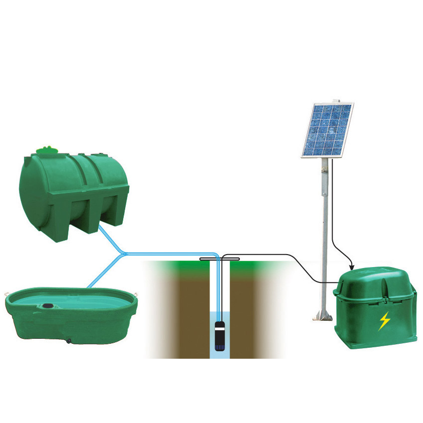 Kit de pompage solaire autonome "Stockage 12 V" : La batterie accumule l'énergie dès que la luminosité est suffisante. Un capteur de niveau d'eau placé dans un bac ou dans une citerne tampon met la pompe en fonction.