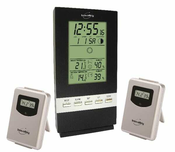 Caractéristiques : Prévisions météo par icones Température et hygrométrie intérieure et extérieure 1 émetteur extérieur (t°+hygro) fournis Tendance des températures Phase lunaire Calendrier et horloge Fonction réveil avec alarme