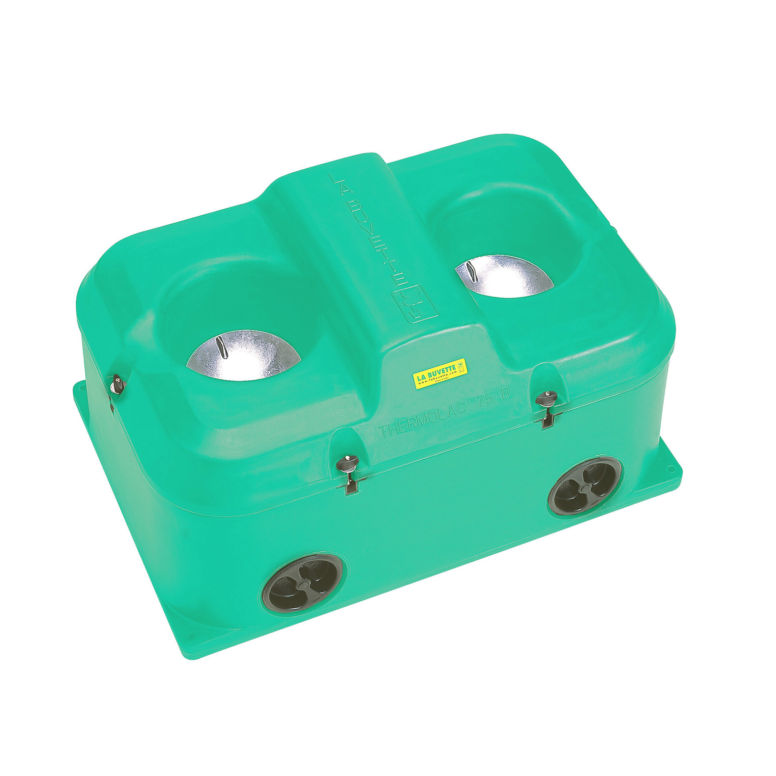 Idéal en extérieur comme en intérieur, le Thermolac fonctionne selon le principe de la bouteille Thermos : double paroi de PEHD isolée de mousse polyuréthane. Efficacité -15°C. Le THERMOLAC™ conserve l'eau à 3-5°C en hiver et à 10-12°C en été. Modèle 75 litres avec coupelles amovibles 1/4 de tour. L'eau est toujours visible et accessible sans effort. Convient pour 20 à 30 chevaux ou bovins et pour 40 à 50 moutons. Robinetterie à flotteur gros débit fiable et durable (identique à celle des modèles GV). Abreuvoir fourni avec tresse inox, gaine isolante et joint d'isolation au sol. Grande vidange Ø 100 mm (effet purge) avec bouchon isolé. Système breveté d'ouverture totale et rapide.