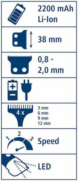 Extra info : - Longueur de rasage 0,8 - 2,0 mm - Fourni avec des peignes de 3, 6, 9 et 12 mm - 3 vitesses 4000/5000/6000 tr/min