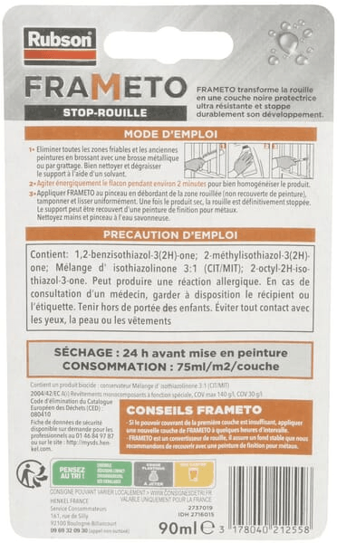 Le traitement Frameto de RUBSON est un traitement antirouille sans plomb rapide et efficace qui s'applique rapidement. Il est idéal pour traiter les métaux ferreux, les meubles de jardin, les portails, les grilles, les appareils ménagers et de nombreuses autres surfaces. Il est appliqué directement sur la rouille.