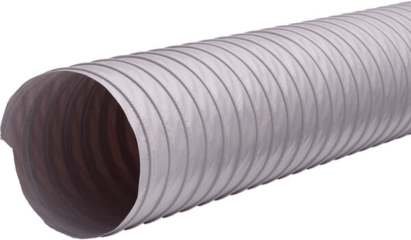Tuyau spiralé léger et très flexible en tissu polyester enduit de PVC. Applications : climatisation, bras d'extractions, aspiration d'air, de gaz et de fumées de soudure, technologie de refroidissement, ventilation Structure : Tissu polyester enduit PVC gris avec fil d'acier à ressort en acier cuivré. Version compactée et filetée de 100mm à 250mm de diamètre intérieur (longueur de tuyau 10m compactée en 1,66m) Température : -30°C jusqu'à 80°C, courte durée jusqu'à 100°C Propriétés : ignifuge, résistance à l'hydrolyse et aux microbes, excellente flexibilité avec petit rayon de courbure, bonne tenue en température, excellente compressibilité axiale.