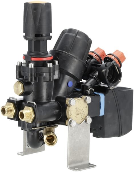 Une vanne de section extra compacte pour les pulvérisateurs de vergers. Cette unité contient une soupape de surpression, un filtre de 50 mesh et deux vannes de section avec dérivation.