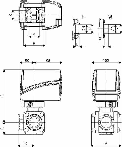 Matière bille : Stainless steel 316 Tension : 12V/ 3 A V Response time : 2,3 s Hauteur de la face supérieure au milieu : 178 mm Fil : 1 1/2'' F Inch Hauteur de la face inférieure au milieu : 52 mm Longueur, raccord à la ligne centrale : 63 mm h : 25 mm A : 128 mm Pression de service max. : 10 bar Diamètre nominal : 40 mm Largeur, passage : 40 mm Y : 49 mm Caractéristiques : - Logement de la rotule en Téflon - Joints toriques internes en Viton - Dispositifs tendeurs pour fixer la bride en acier inoxydable, protégés par le boîtier de vanne Informations techniques : - L'abréviation « A » dans le numéro d'article signifie : filet femelle des deux côtés , « E » signifie filet mâle des deux côtés - NO : normally open - Les vannes sont conçues pour la fonction 3 voies (++-) avec une alimentation 12 Vcc : Tant que la commande est alimentée, la vanne se tourne et se met en position pour interrompre elle-même l'alimentation en courant. En cas de coupure de courant, le motoréducteur remet la rotule dans sa position d'origine - Les vannes sont également compatibles avec des commandes à 2 voies : Dans ce cas, elles commandent l'ouverture/la fermeture en inversant la polarité de l'alimentation grâce à une double déviation