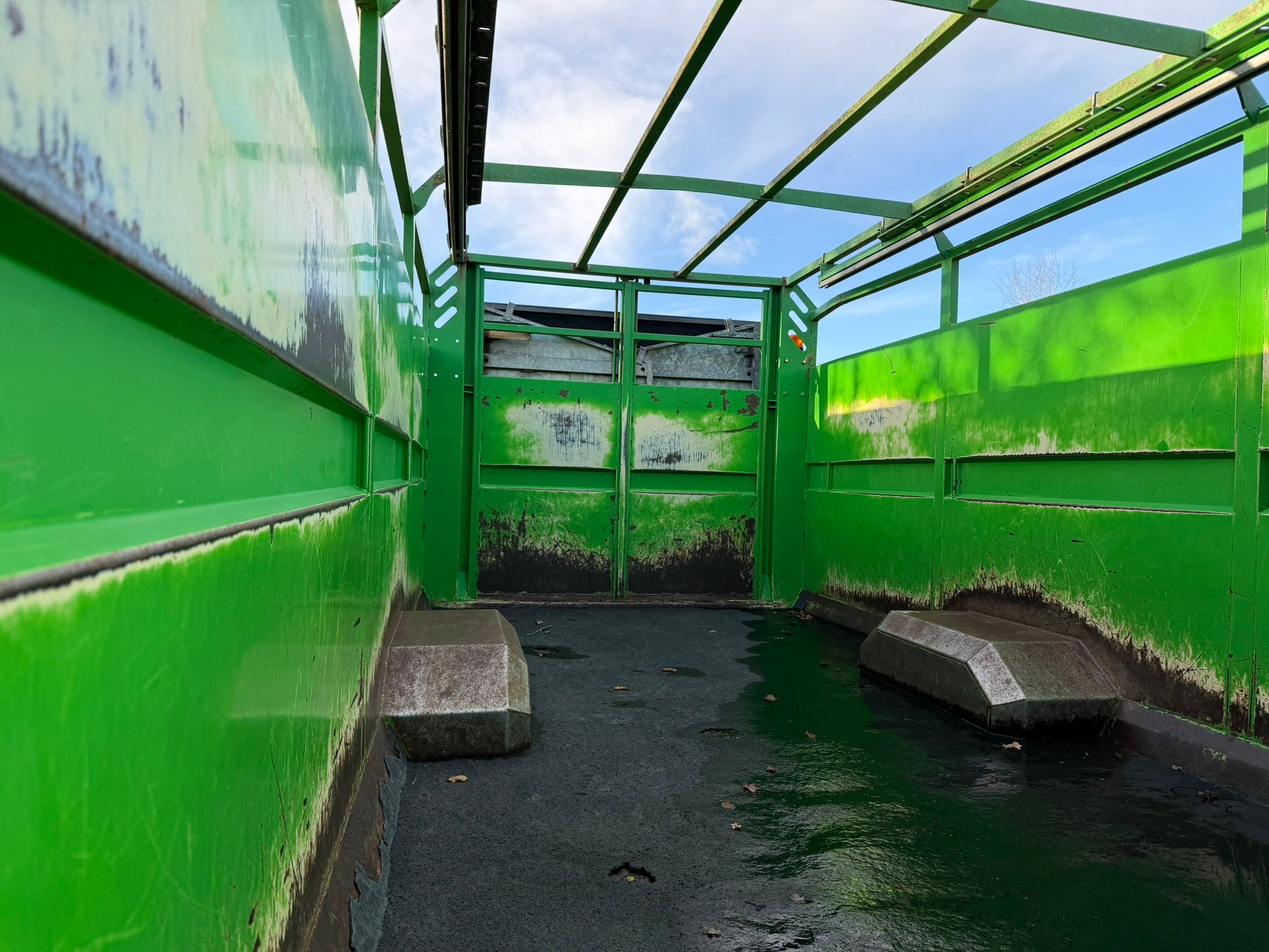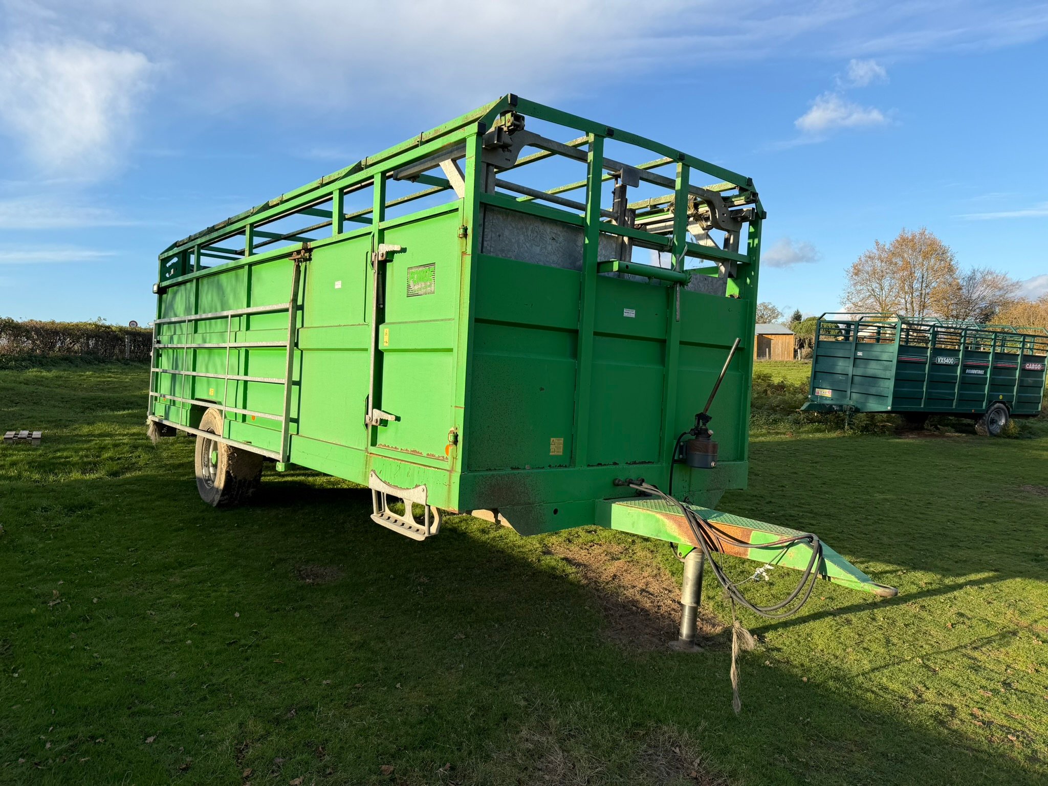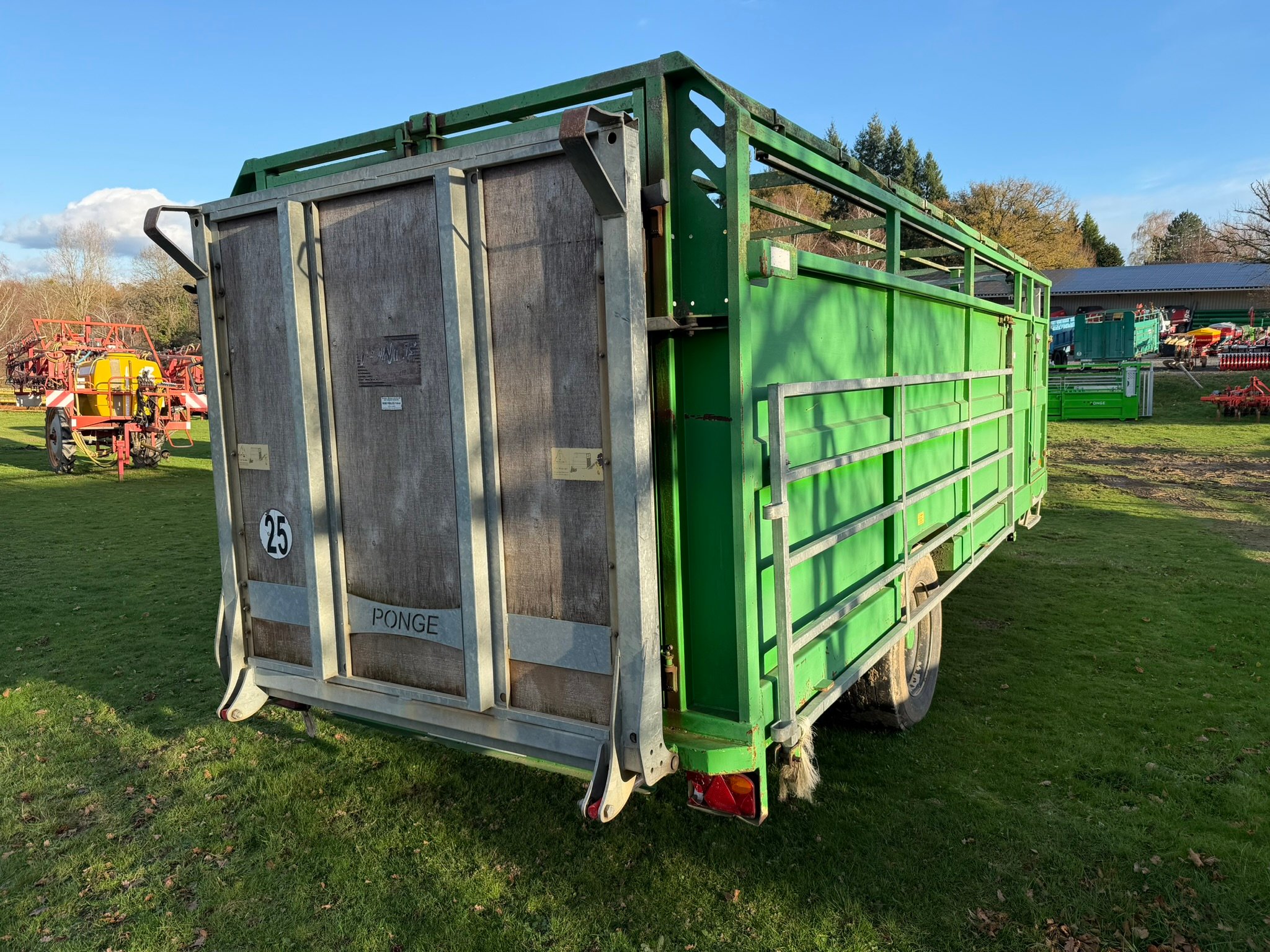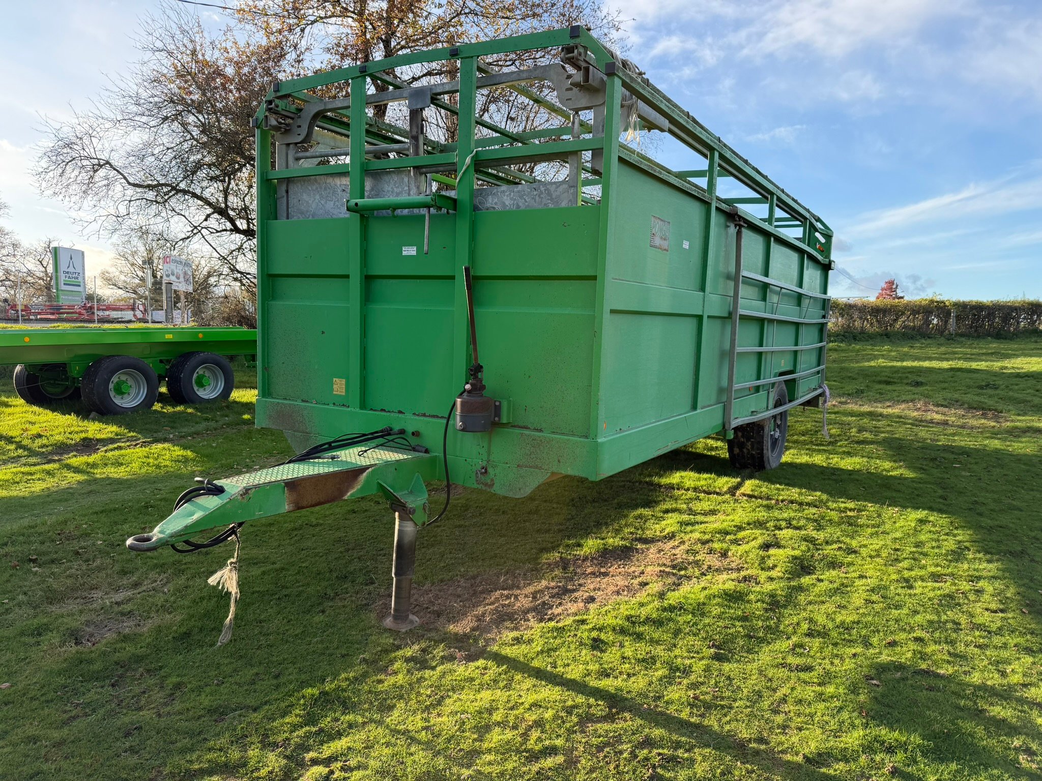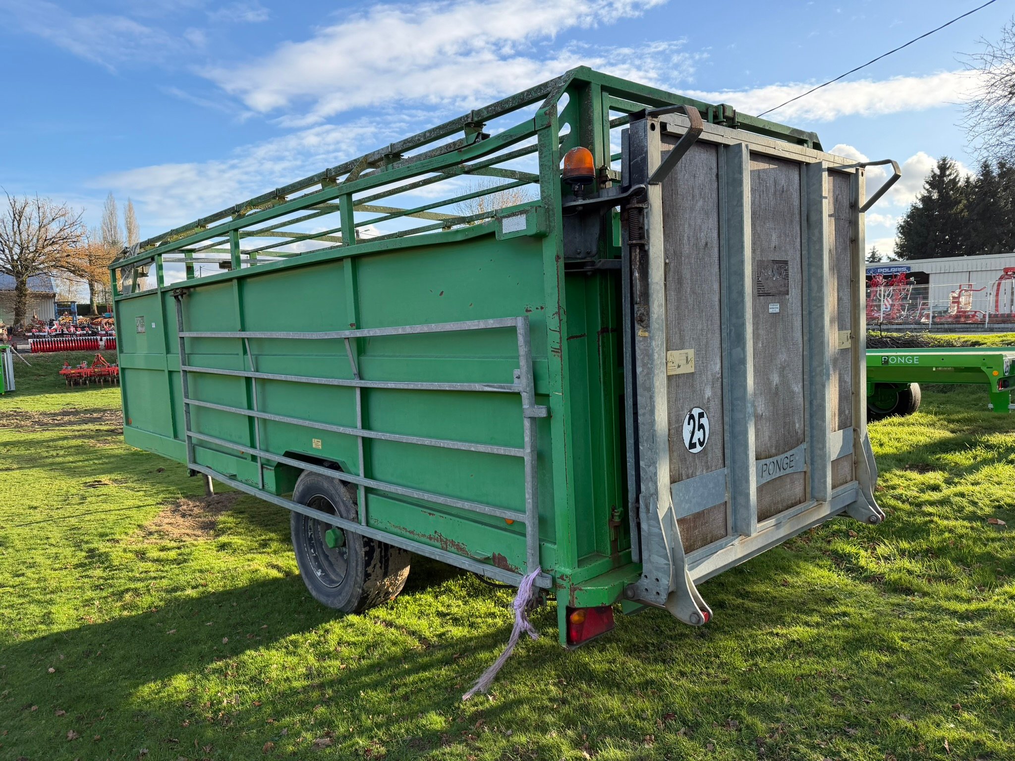 | Détails | Bétaillère Ponge BPS12, longueur de caisse 7m90, PTC 12T, freinage hydraulique, pont rabattable, séparation suspendue sur rails, barrière de chargement coulissante |